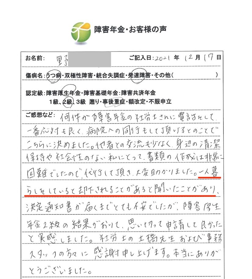 何件か障害年金の社労士さんに電話をして一番対応もよく病院へ同行もして頂けるとのことで、こちらに決めました。他者との交流も少なく身辺の清潔保持や社会性のない私にとって、書類の作成は非常に困難でしたので、代行して頂き大変助かりました。一人暮らしをしていると却下されることがあると聞いたことがあり、決定通知書が届くまでとても不安でしたが、障害厚生年金2級の結果がおりて、思い切って申請して良かったと実感しました。社労士の土橋先生および事務スタッフの方々に感謝申し上げます。本当にありがとうございました。