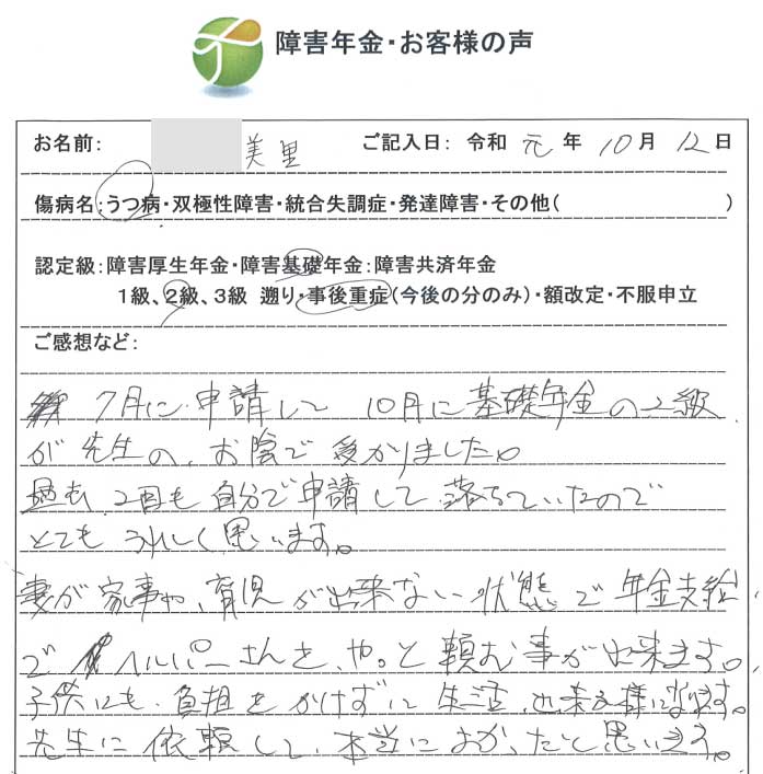疾病名:うつ病(F-32) 受 給:障害基礎年金2級 5年分遡及 6,746,142円! 依 頼 日:平成31年 1月25日 ⇒ 申 請 日:令和 元年 6月28日 支給日決定:令和 元年10月 3日 ⇒ 初回振込日:令和 元年11月15日▶詳細を見る: 涼子様 兵庫県明石市この度は大変な御苦労をおかけしまして私の為に尽力して下さってありがとうございます。お会いした事の無い中でどのように進んでいるか正直不安でした。その中無事に障害年金を受け取ることが出来、ほっとし感謝しております。再婚をしていい方と一緒に生活する上で働けない自分を責めておりました。子供達のためにしっかりせねばと思うほど慣れない土地で働く事も怖くなり外に出て行く事も怖くなりました。未だに一進一退ではりきり行事など参加した後は、疲れ果て不安がおそってくるような毎日ですが大事にしてくれるパートナーとこれからも歩んでいけたらと思います。鹿児島のとそ幼稚園は昔から音楽幼稚園として長淵剛さん、辛島みどりさん、柏木ゆきさんなど卒園されており二人の子供達もここを卒園しました。自分の病気と戦いながらの子育てでしたが、中2、小5と成長しました。一時的に大額のお金が入りますが、二人の子供達の今後の教育費のため貯金しようと思います。少しですがラーメンがお好きとの事でふるさとのラーメンとお子様がいらっしゃるそうなので少しお菓子を送ります。ご笑納くださいませ。文様 大阪市北区