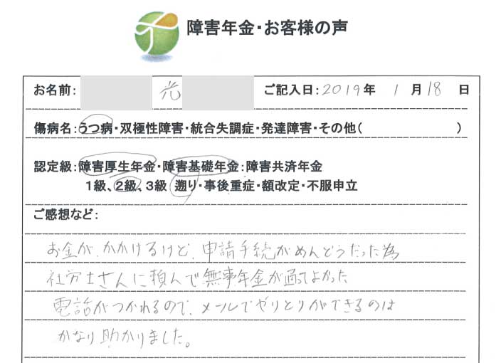 お金がかかるけど申請手続きがめんどうだった為社労士さんに頼んで無事に年金が通ってよかった。電話が疲れるのでメールでやりとりできるのはかなり助かりました。
