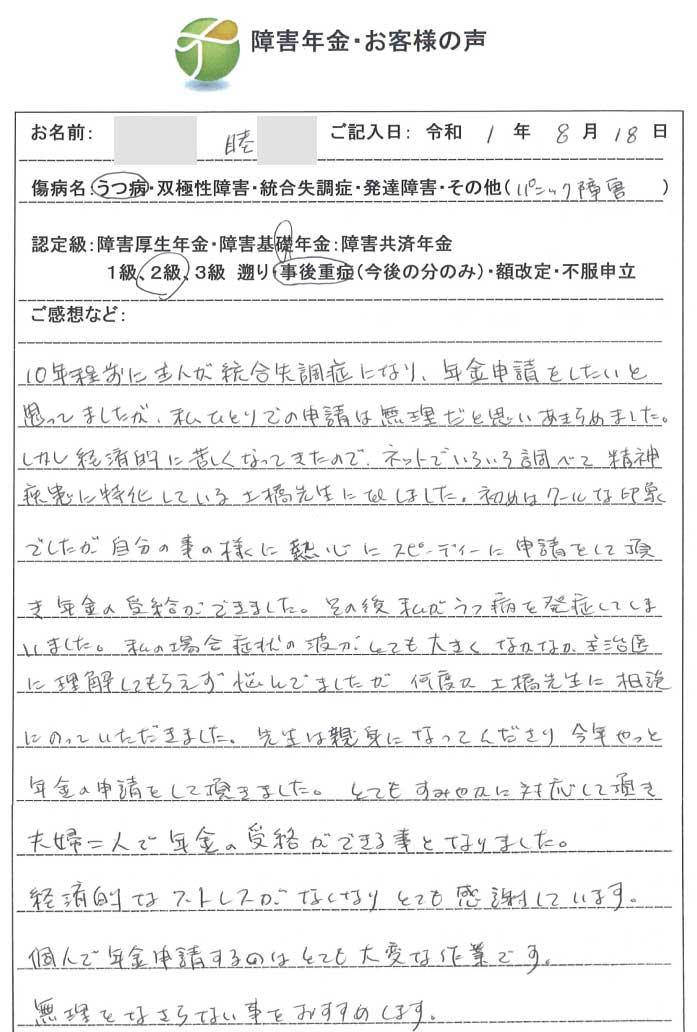 10年程前に主人が統合失調症になり、年金申請をしたいと思っていましたが、私一人での申請は無理だとあきらめていました。しかし経済的に苦しくなってきたので、ネットで色々調べて精神疾患に特化している土橋先生にTELしました。初めはクールな印象でしたが自分の事の様に熱心にスピーディーに申請をして頂き年金の受給ができました。その後私がうつ病の発症してしまいました。私の場合症状の波がとても大きくなかなか主治医に理解してもらえず悩んでいましたが、何度か土橋先生に相談にのっていただきました。先生は親身になってくださり今年やっと年金申請をして頂きました。とても速やかに対応していただき夫婦二人で年金の受給ができる事となりました。経済的なストレスがなくなりとても感謝しています。個人で年金申請するのはとても大変な作業です。無理なさらない事をおすすめします。