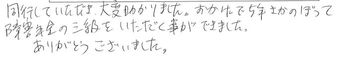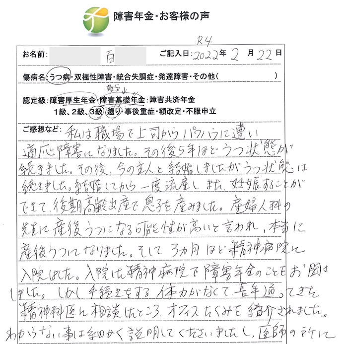 私は職場で上司からパワハラに遭い適応障害になりました。その後5年ほどうつ状態が続きました。その後今の主人と結婚しましたが、うつ状態が続きました。結婚してから一度流産しました。妊娠することができて後期高齢出産で息子を産みました。産婦人科の先生に産後うつになる可能性が高いと言われ、本当に産後うつになりました。そして3か月ほど精神病院に入院しました。入院した精神病院では障害年金のことをお聞きしました。しかし手続きする体力がなくて長年通ってきた精神科医に相談したところオフィスたくみを紹介されました。わからない事は細かく説明してくださいましたし、医師の所に同行していただき、大変助かりました。おかげで5年遡って障害年金3級をいただく事ができました。ありがとうございました。